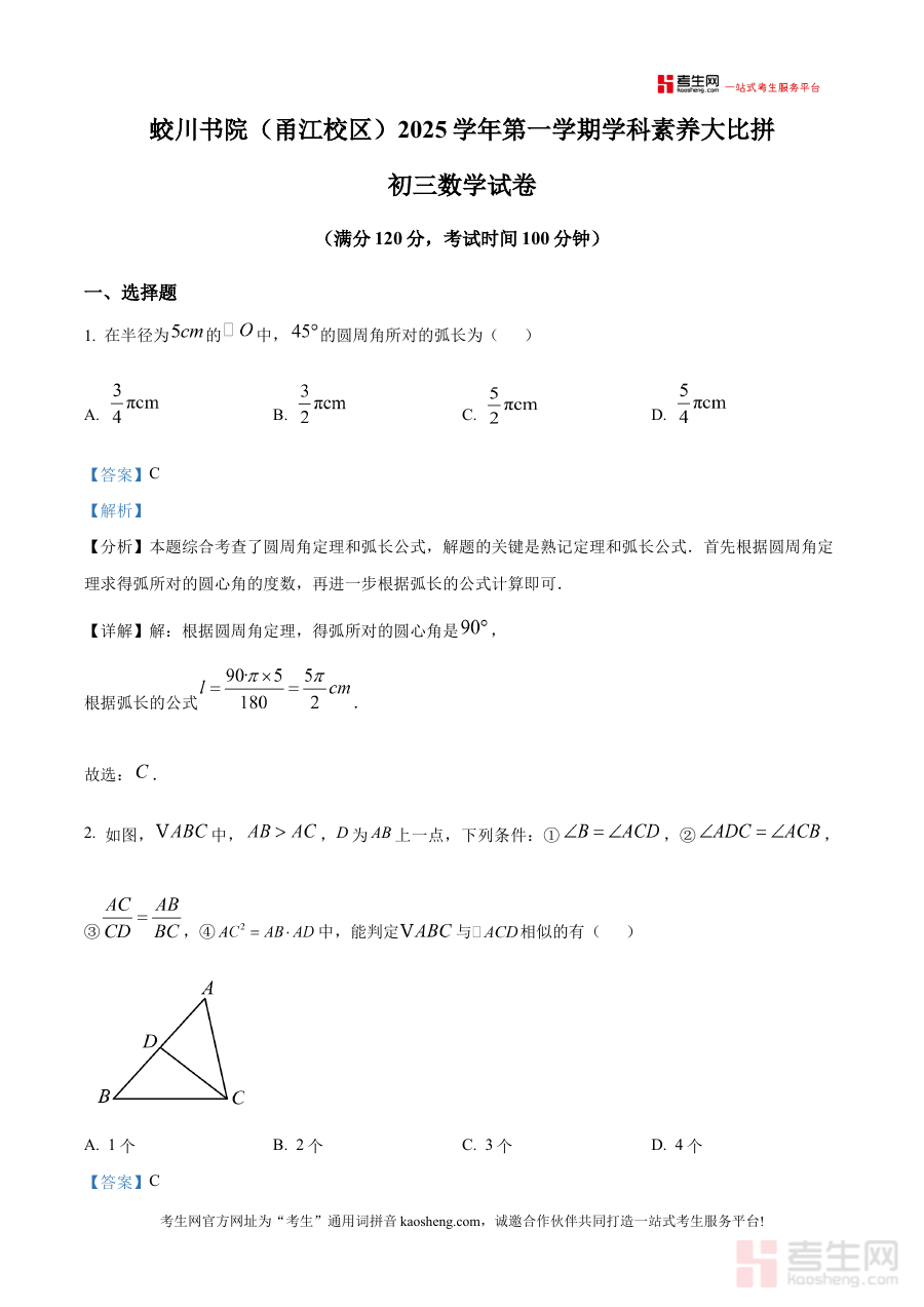 《精品解析:浙江省宁波市镇海蛟川书院2025-2026学年九年级上学期学科素养大比拼数学试卷(解析版)》是针对浙江省宁波市镇海蛟川书院特定学年段与考试类型的数学学科备考资料。该资料对应2025-2026学年九年级上学期的学科素养大比拼考试场景,聚焦数学学科的素养考查需求,以解析版形式呈现相关内容,帮助使用者精准把握考试的核心导向与学科能力要求,为后续的学习与备考提供直接参考。