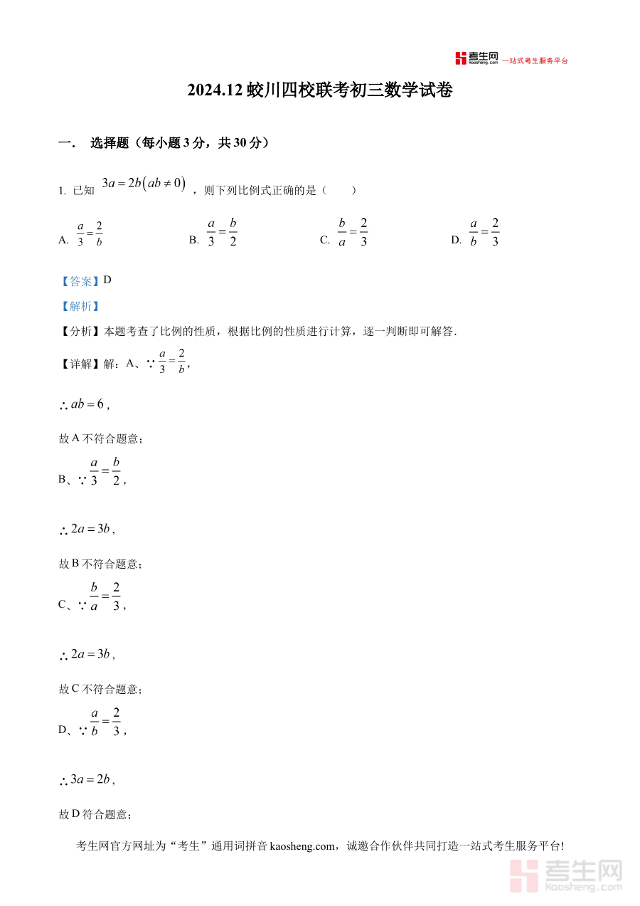 《精品解析:浙江省宁波市镇海蛟川书院等四校2024--2025学年九年级上学期12月联考数学试卷(解析版)》是针对浙江省宁波市镇海蛟川书院等四所学校联合组织的2024-2025学年九年级上学期12月数学联考的配套解析资料,聚焦该阶段阶段性考试需求,为相关师生提供专业参考依据。