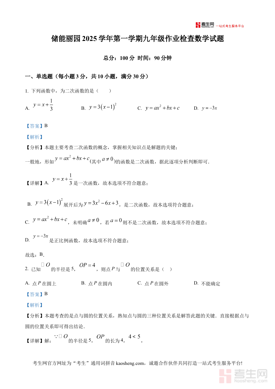 该资料主要适用于浙江省宁波海曙储能学校丽园校区2025-2026学年九年级学生,也适用于该校区数学教师及学生家长。对学生而言,可通过解析深化对考试内容的理解;对教师而言,可用于教学评估与指导;对家长而言,能辅助了解孩子学习状况并提供支持。其价值在于通过阶段检测与解析结合,助力使用者明确学习重点,优化备考路径,为九年级上学期数学学习筑牢基础。
