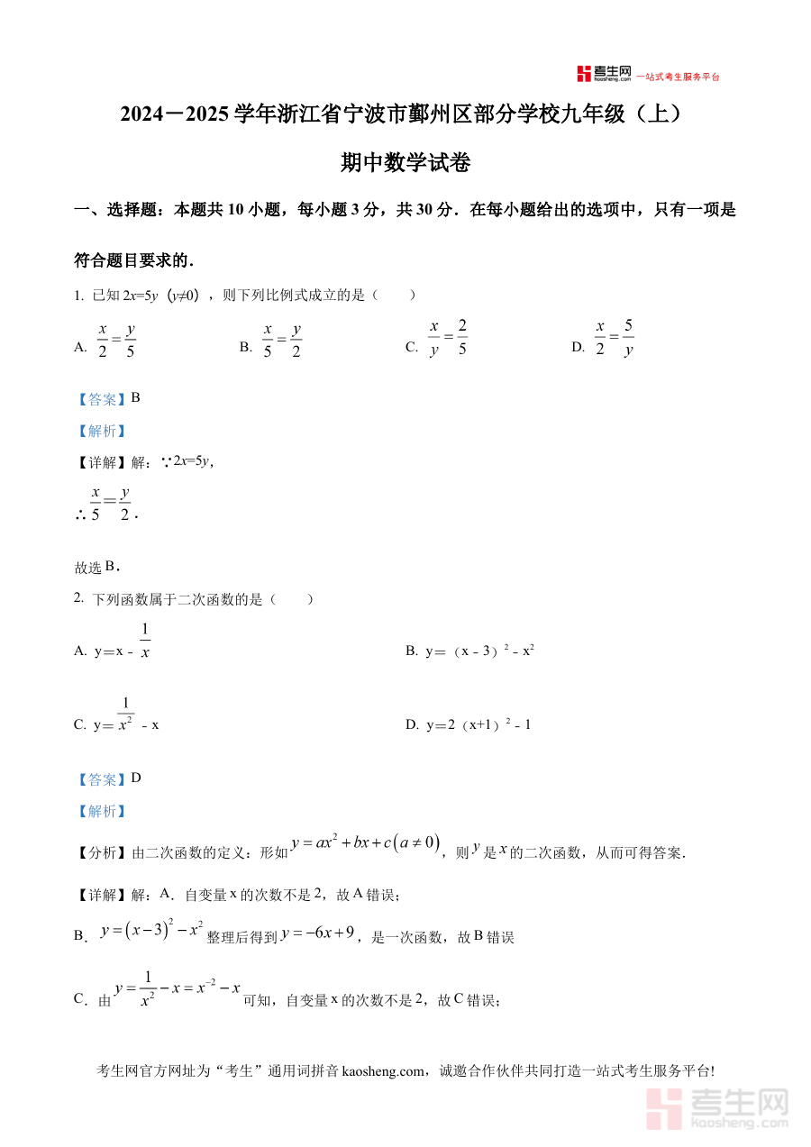 《精品解析:浙江省宁波市鄞州区部分学校2024-2025学年九年级上学期期中数学试卷 (解析版)》是针对浙江省宁波市鄞州区部分学校在2024-2025学年秋季学期开展的九年级上学期期中数学考试所编制的专业备考辅助资料。该资料紧密贴合该区域特定学校的期中检测要求,为相关使用者提供了与考试实际场景相匹配的参考内容框架,帮助使用者提前熟悉该阶段考试的整体命题导向和核心考查范围,为后续的针对性学习奠定基础。