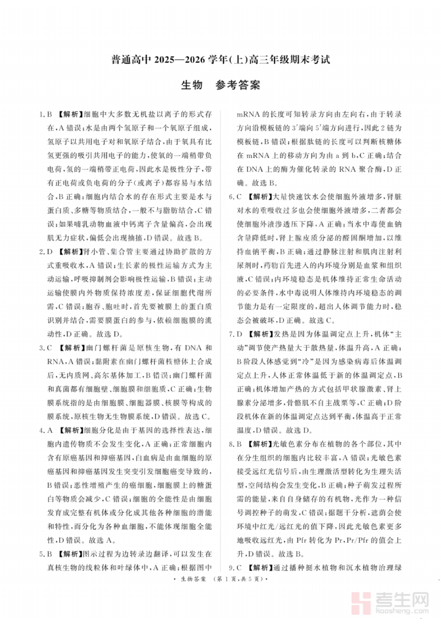 《生物答案-青桐鸣高三联考202602》是针对2026年2月举办的青桐鸣高三联合考试生物科目的配套参考答案资料,属于高中三年级阶段区域性学业水平联合检测的重要辅助资源。该资料与本次联考的生物试卷内容直接对应,为考生和教学工作者提供了精准的答题参考依据,是联考后续分析环节中不可或缺的组成部分,能够帮助使用者快速对接试卷内容并完成答题结果的核对工作。