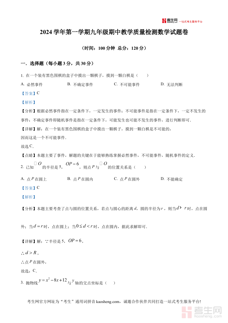 《精品解析:浙江省宁波市余姚市六校2024-2025学年上学期九年级期中联考数学试卷(解析版)》是针对浙江省宁波市余姚市六所学校联合组织的2024-2025学年上学期九年级期中数学考试的专业配套解析资料,精准对应该区域特定阶段的数学学科联考场景,为相关教学实施与学习提升提供具有区域针对性的参考依据。