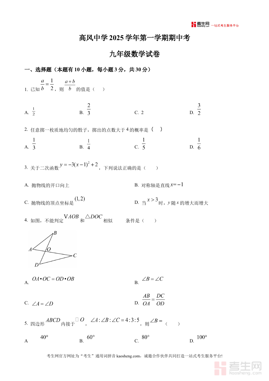 《精品解析:浙江省宁波市余姚市高风中学2025-2026学年九年级上学期期中考试数学试卷(原卷版)》是针对浙江省宁波市余姚市高风中学2025-2026学年九年级上学期期中考试的数学学科备考资料,聚焦该阶段数学学习的阶段性考查需求,为师生提供与学校期中检测直接相关的原卷资源。
