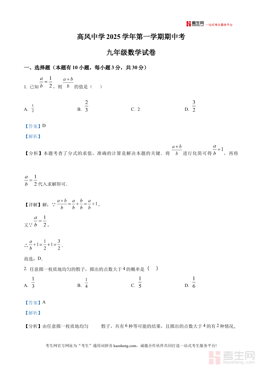 其适用人群主要为浙江省宁波市余姚市高风中学2025-2026学年九年级的学生及数学教师,对于学生而言,能通过解析内容强化对期中考点的理解与应用能力;对于教师来说,可借助该资料优化教学策略与检测评估方式,提升阶段教学质量,具有显著的阶段检测与备考规划价值。