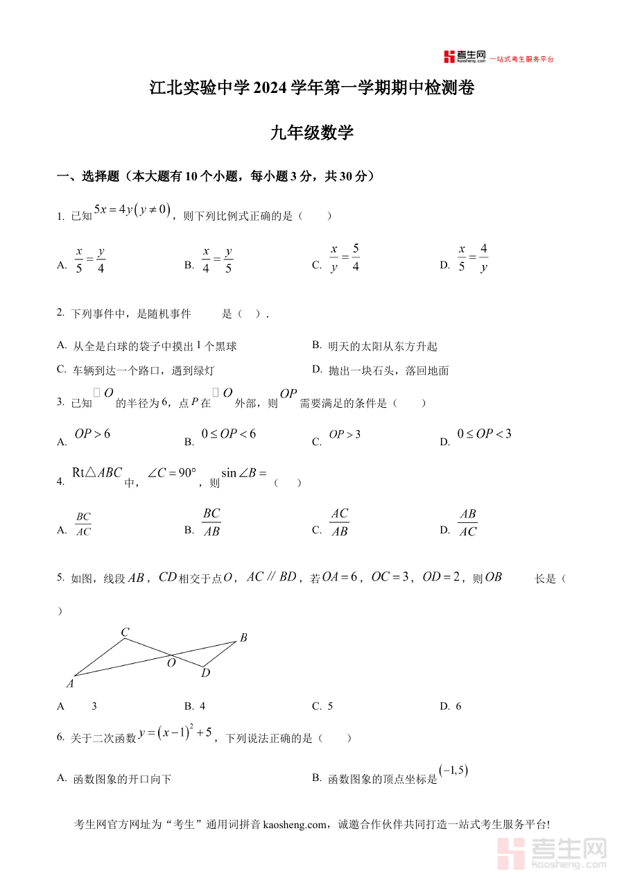 《精品解析:浙江省宁波市江北实验中学2024-2025学年九年级上学期期中考试数学试题(原卷版)》是针对浙江省宁波市江北实验中学2024-2025学年九年级上学期期中考试设计的数学学科备考资料,聚焦该阶段期中检测的核心需求,为相关师生提供贴合本地教学实际的标准化考试资源。