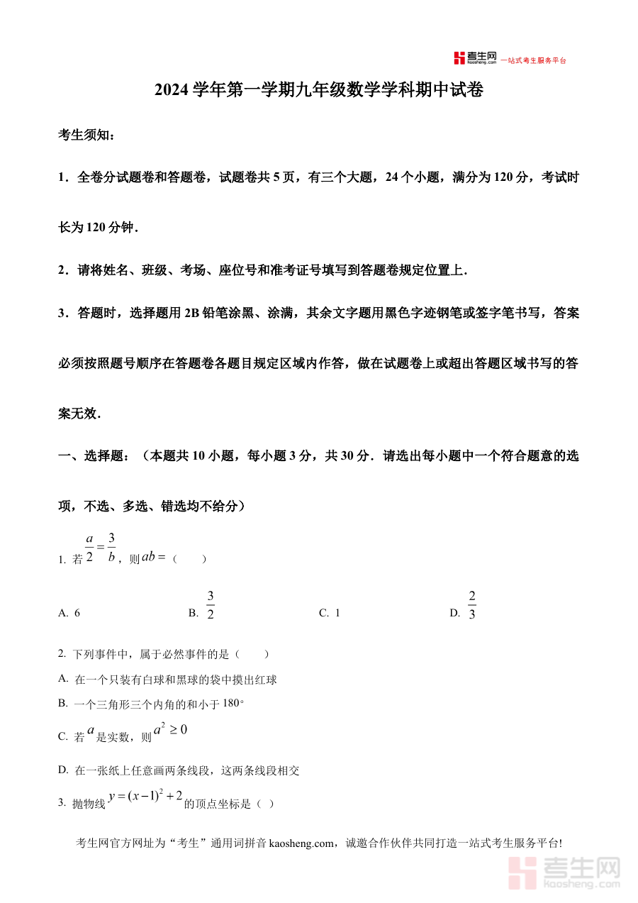 《精品解析:浙江省宁波市海曙区洞桥镇中心初级中学 2024-2025学年上学期 九年级数学学科期中试卷(原卷版)》是针对浙江省宁波市海曙区洞桥镇中心初级中学2024-2025学年上学期九年级数学期中阶段考试的配套备考资料,聚焦该学期中期的数学学科检测场景,为相关教学与学习活动提供对应阶段的考试内容参考。