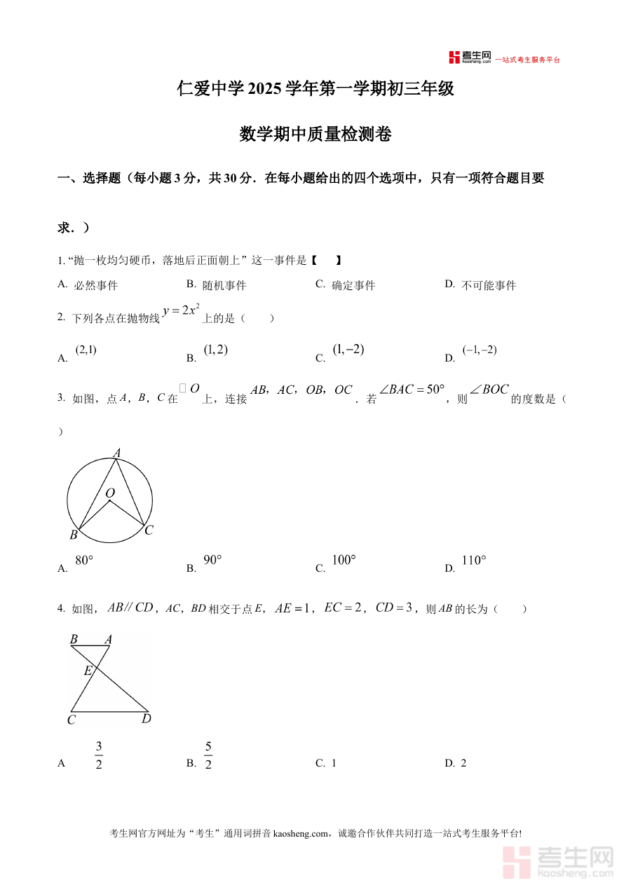 该检测卷适用于浙江省宁波市镇海区仁爱学校2025-2026学年上学期的九年级学生及数学教师,通过真实的期中检测场景还原,能有效提升学生的阶段检测适应能力,同时为教师的阶段性教学评估与备考指导提供实用参考,助力师生在期中阶段实现高效复习与针对性提升。