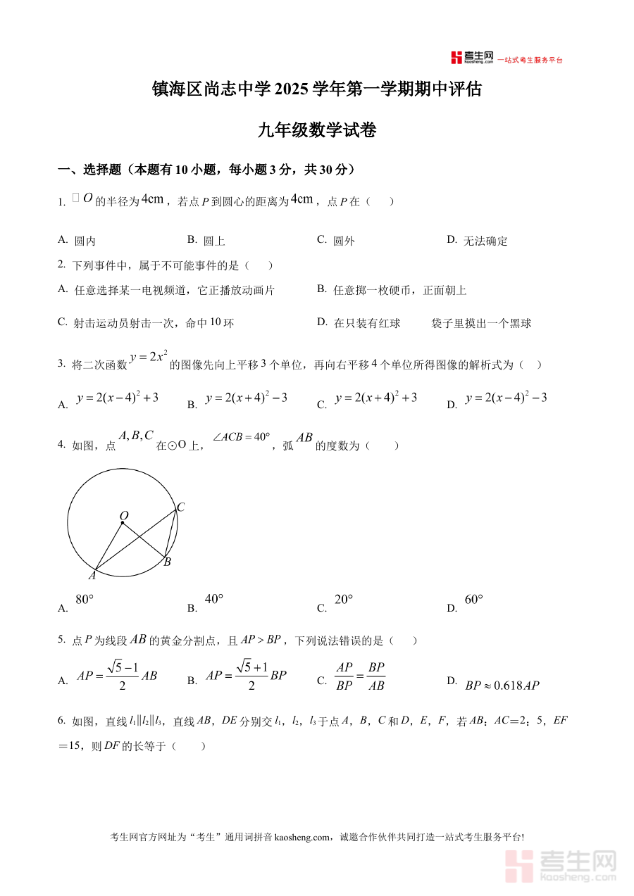 《精品解析:浙江省宁波市镇海区尚志中学2025-2026学年九年级上学期期中数学试卷(原卷版)》是针对浙江省宁波市镇海区尚志中学2025-2026学年九年级上学期期中数学考试的备考资料,包含该阶段期中数学考试的原卷内容,能够为相关使用者提供与实际考试形式一致的练习载体,帮助使用者提前熟悉考试的呈现方式和整体框架,是贴合该中学九年级学生期中数学备考需求的针对性材料。