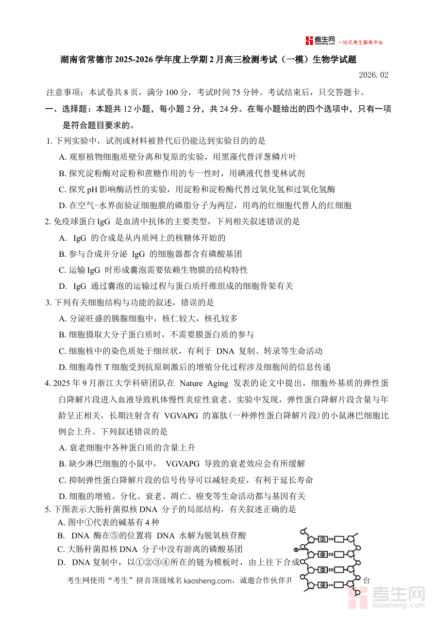 此资料适用于湖南省常德市2025-2026学年度上学期的高三学生及生物学教师,作为高三一模考试的备考参考,能有效辅助学生进行阶段检测练习,明确备考方向,同时为教师的教学调整与指导提供支持,具有较强的阶段实用性。