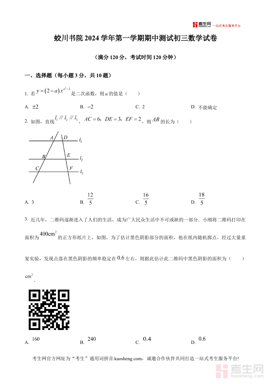 《精品解析:浙江省宁波市镇海蛟川书院2024--2025学年九年级上学期 期中数学试卷(原卷版)》是针对浙江省宁波市镇海蛟川书院2024-2025学年九年级上学期期中数学考试的专属备考资料,明确对应特定学年、学期、年级及学科的期中检测场景,为相关师生提供与该次考试直接关联的原卷资源,帮助使用者快速对接考试的实际形式与要求,是阶段学习成果验证与备考准备的重要参考材料。