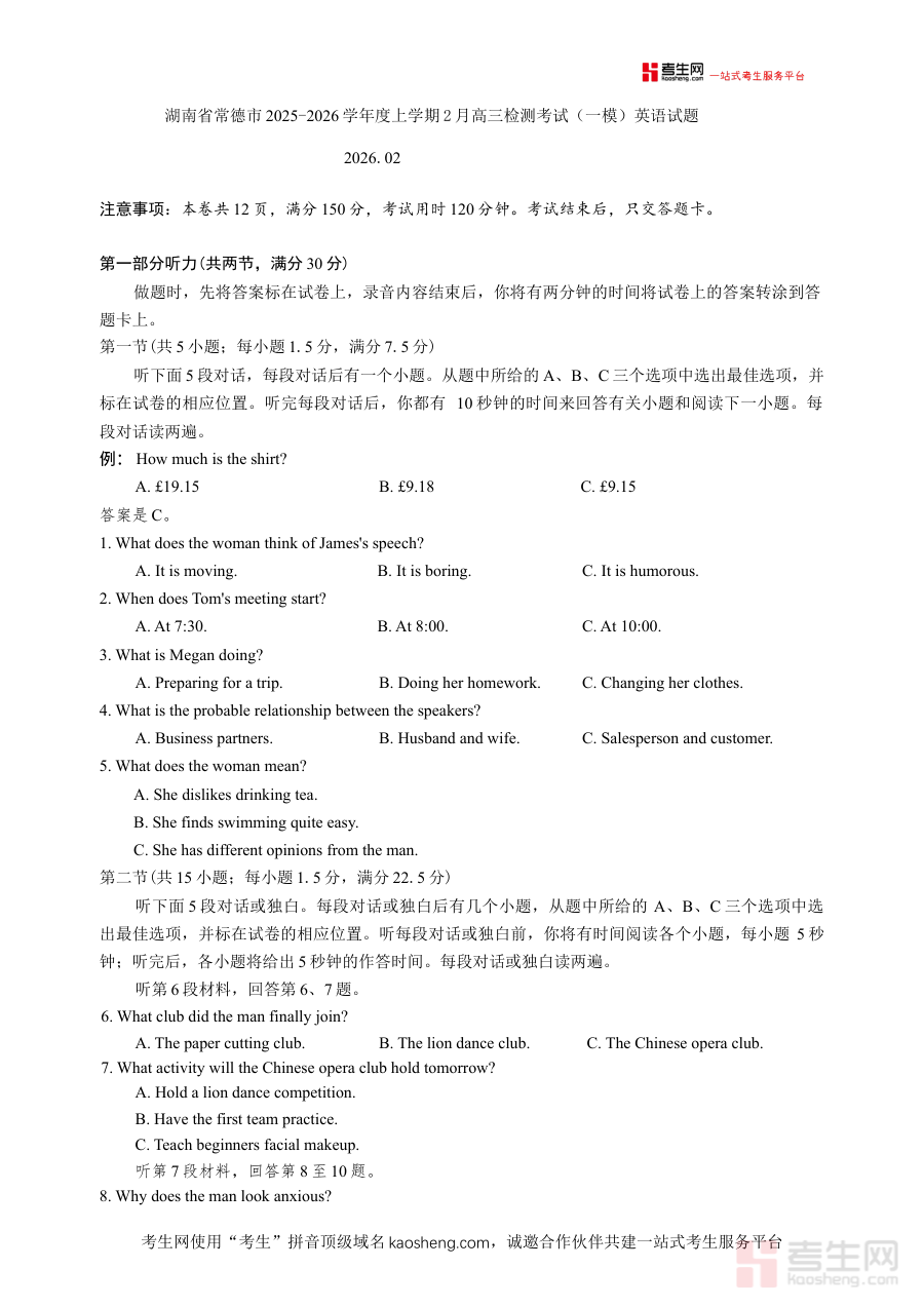 《湖南省常德市2025-2026学年度上学期2月高三检测考试(一模)英语试题(含答案)》是针对湖南省常德市特定学年度与时间节点的高三英语学科检测资料,包含试题与配套答案两部分内容。该资料对应2025-2026学年度上学期2月举办的高三一模检测考试,属于高三英语备考阶段的重要参考资源,能够为使用者提供与区域考试直接相关的练习与评估素材,帮助使用者快速对接本地考试的具体要求。