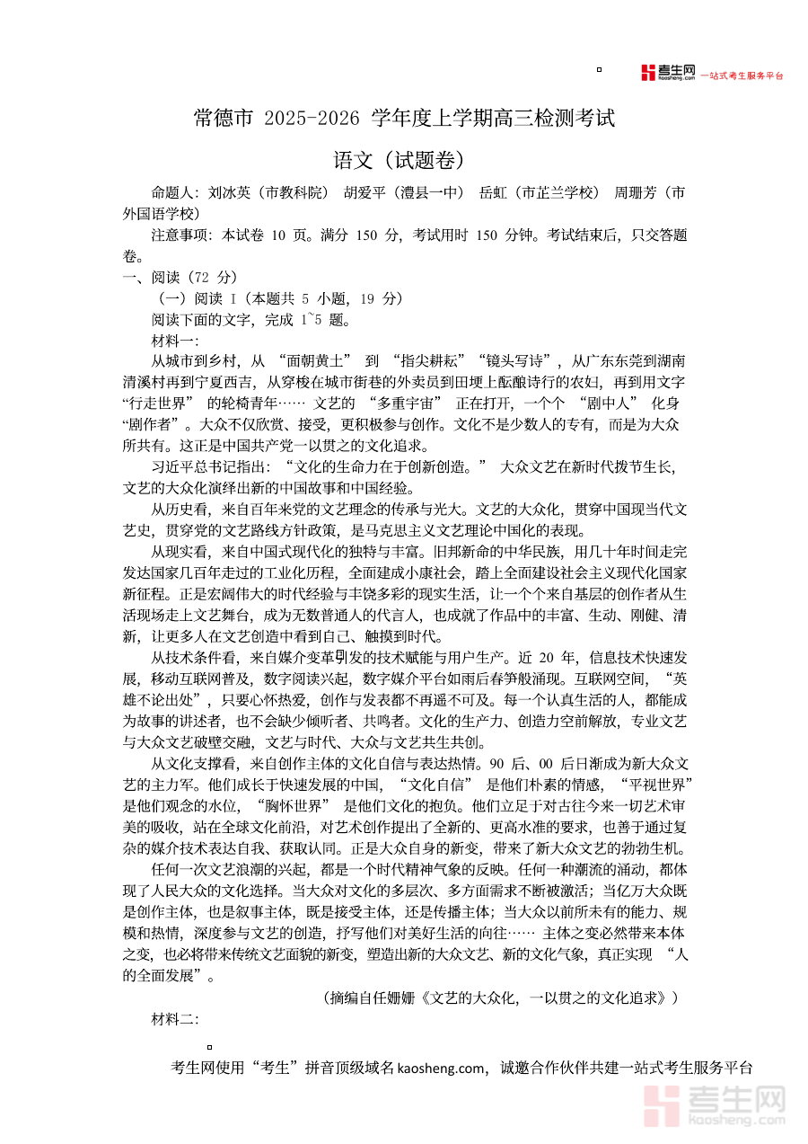 《湖南省常德市2025-2026学年度上学期2月高三检测考试(一模)语文试题(含答案)》是湖南省常德市教育系统在该学年度上学期针对高三学生组织的首次模拟检测考试的语文科目试题及配套参考答案,属于高三阶段关键的高考备考资料,能够体现当地高三语文教学的阶段性目标和高考命题方向的初步指引。