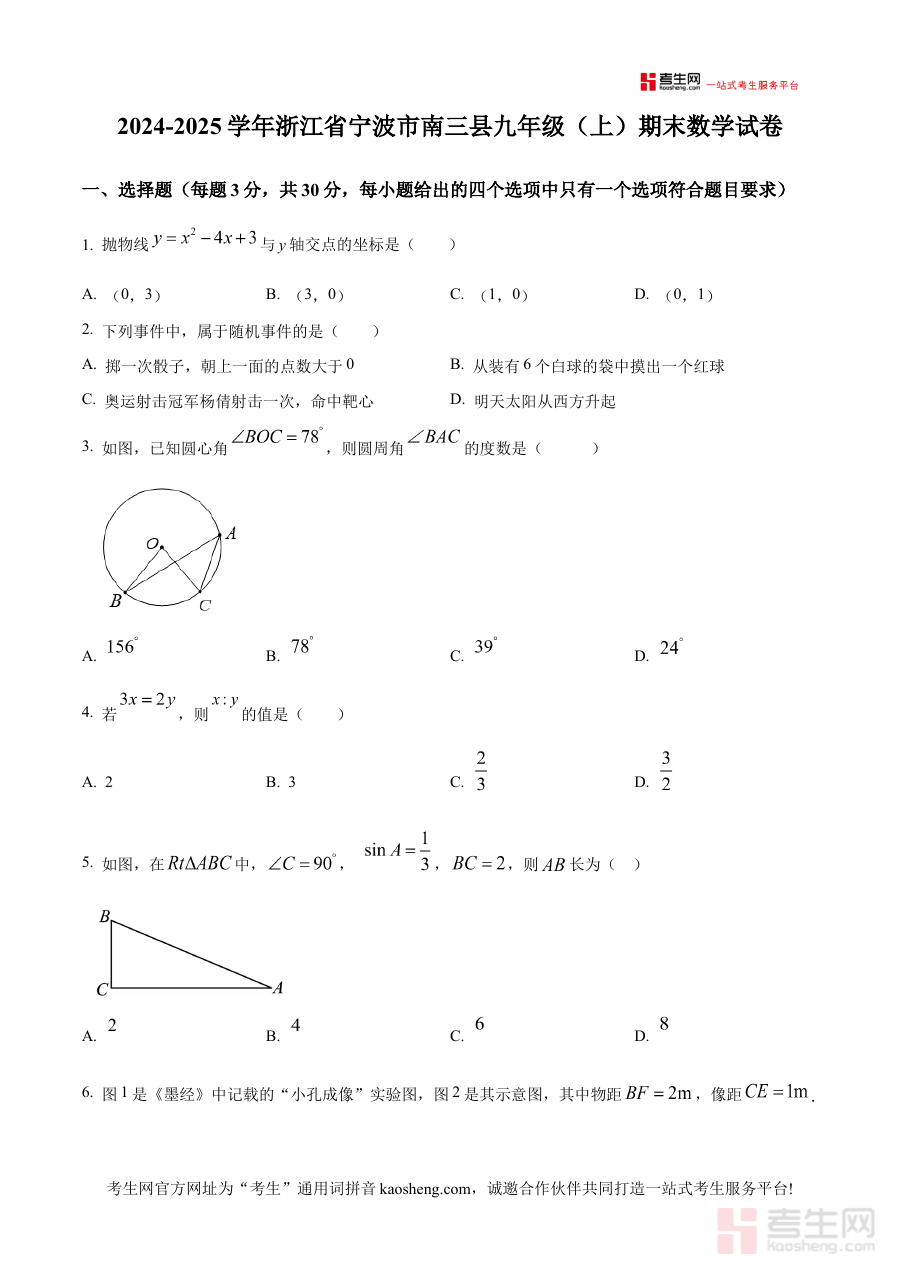 《精品解析:浙江省宁波市南三县2024-2025学年九年级上学期期末数学试卷(原卷版)》是针对浙江省宁波市南三县特定学年与学段的数学期末考试资料,精准对应2024-2025学年九年级上学期的期末数学考试要求,作为原卷版资料,它能够真实反映该地区该阶段期末数学考试的整体结构与呈现形式,为相关群体提供直接且贴合实际的备考参考依据。