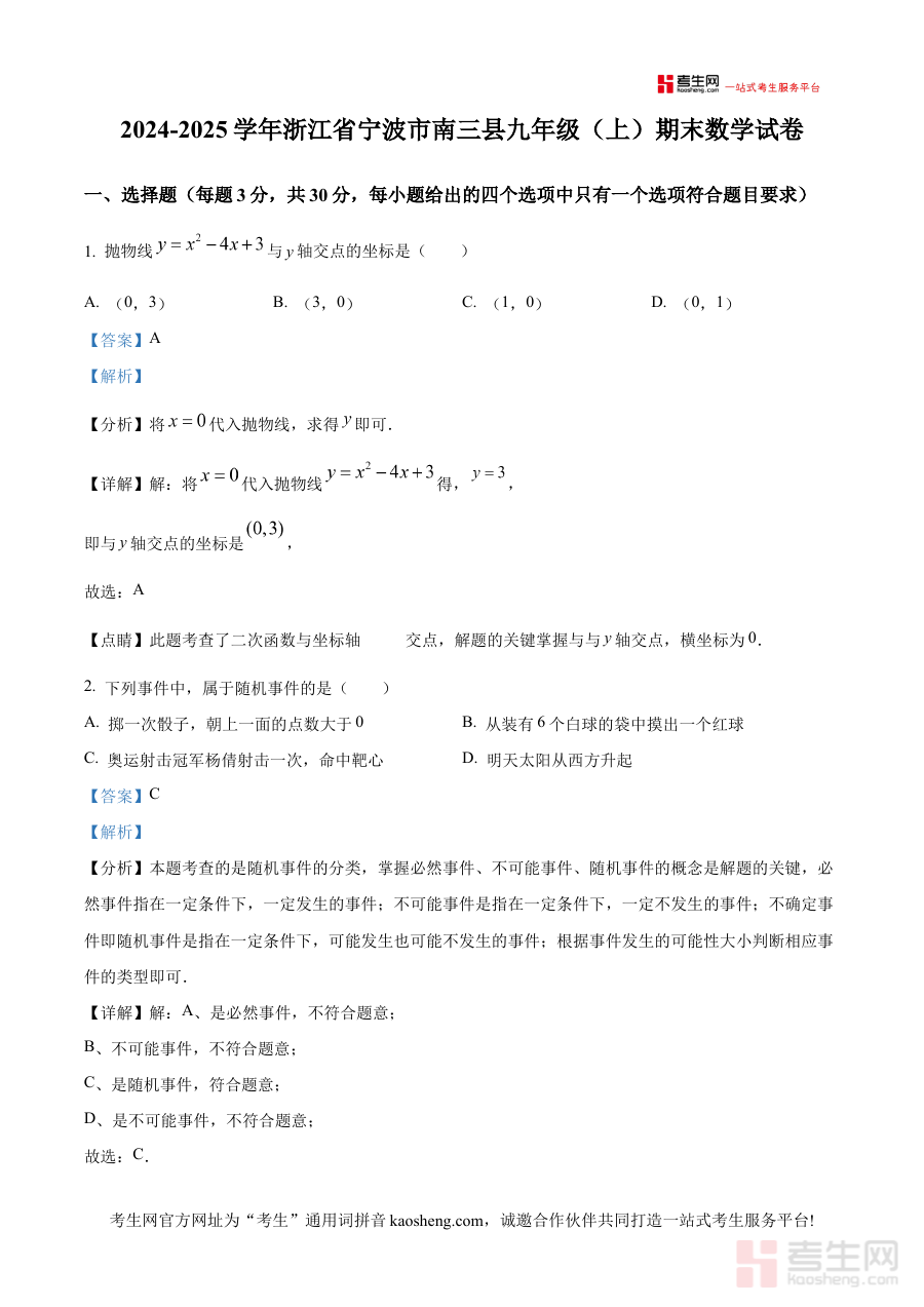 《精品解析:浙江省宁波市南三县2024-2025学年九年级上学期期末数学试卷(解析版)》是针对浙江省宁波市南三县2024至2025学年九年级上学期期末数学考试的专项备考资料,整合了该地区对应学年段期末数学考试的相关内容及专业解析,为使用者提供贴合本地考试实际的学习参考依据。