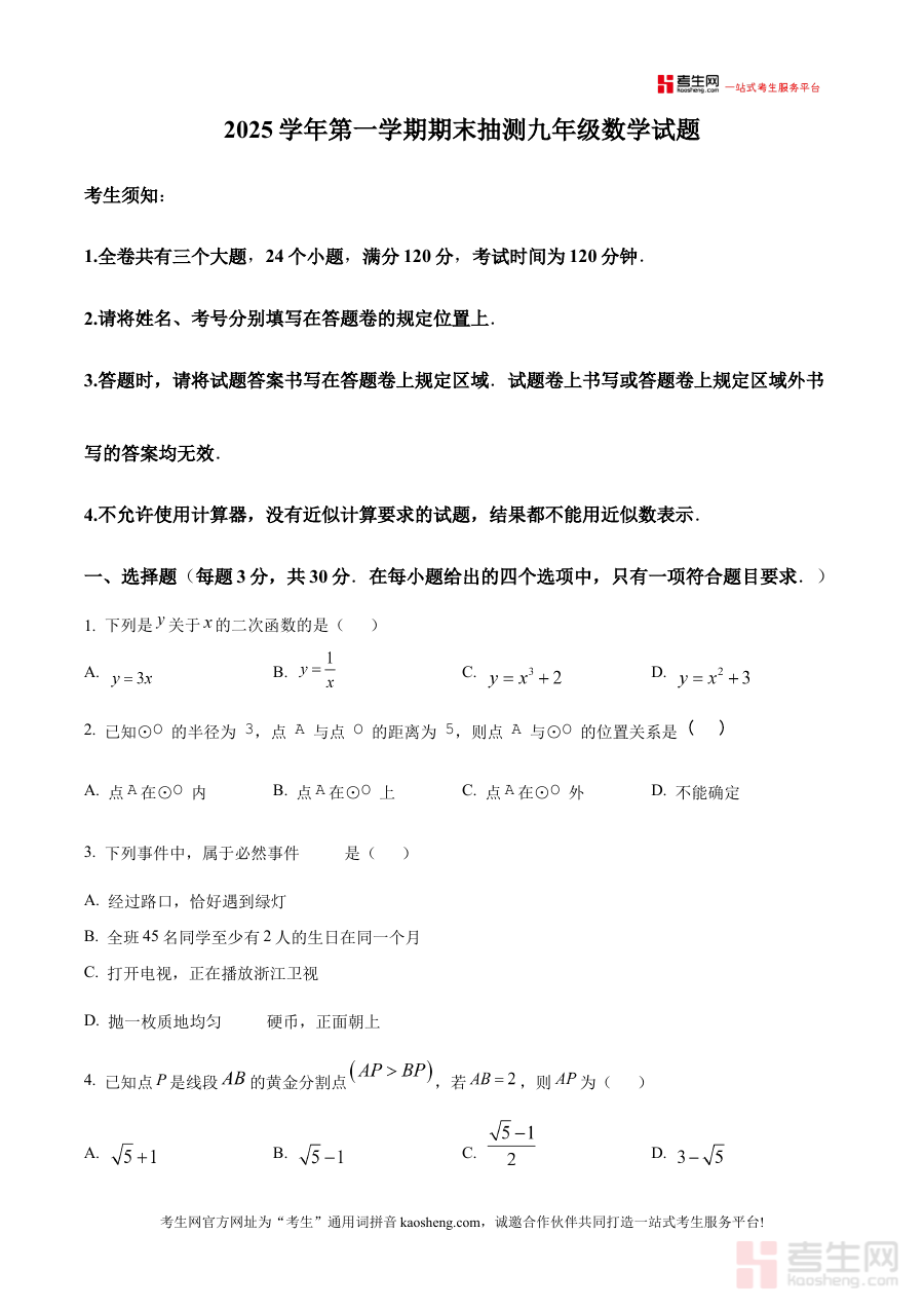 《精品解析:浙江省宁波市南三县2025-2026学年九年级上学期1月期末数学试题(原卷版)》是针对浙江省宁波市南三县特定学年与学段的数学期末考试资料,明确覆盖2025-2026学年九年级上学期1月的期末考范畴,作为原卷版备考资料,它直接呈现该地区该阶段数学期末考试的官方试卷形态,为使用者提供与实际考试一致的试卷参考,是备考过程中获取真实考试信息的重要资源。