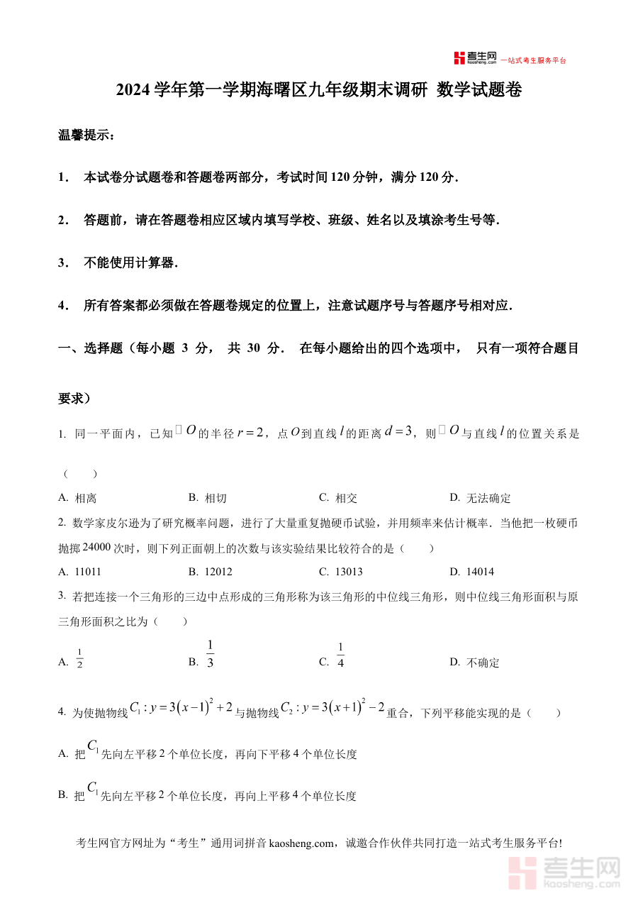 《精品解析:浙江省宁波市海曙区2024—2025学年上学期九年级期末考试数学试卷(原卷版)》是面向浙江省宁波市海曙区2024至2025学年上学期九年级数学期末考试的备考资料,精准对应该地区该学段的期末检测场景,为使用者提供贴合本地考试实际的原卷内容支持。