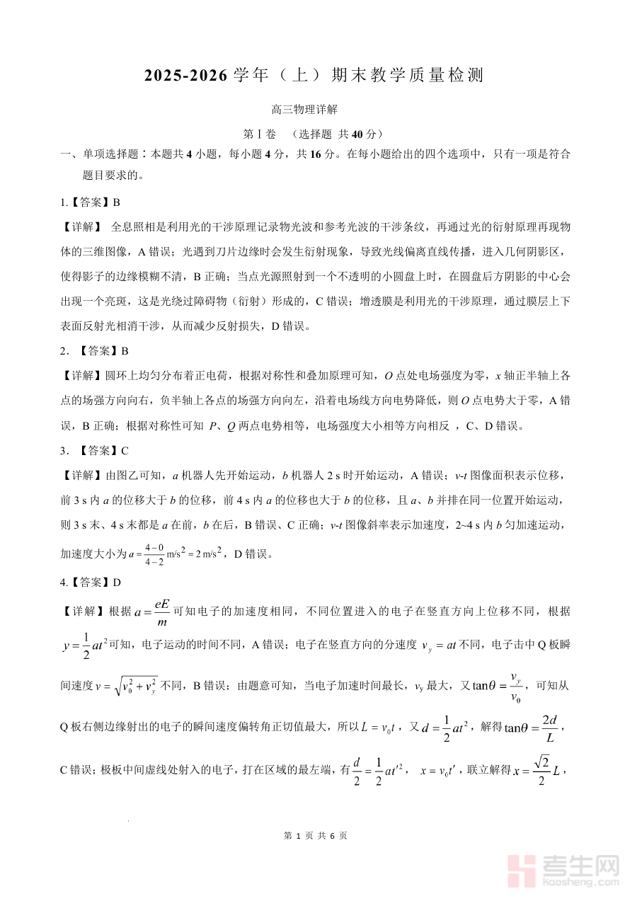 该资料适用于2025—2026学年第一学期结束后参加高中物理期末教学质量检测的学生群体以及承担高中物理教学任务的教师群体。对于学生而言,对照答案可及时发现自身物理学习中的薄弱环节,为寒假期间的针对性复习和下学期的学习提升提供支持;对于教师而言,借助该答案能更高效完成试卷批改与学情分析,助力后续教学计划的优化与完善。