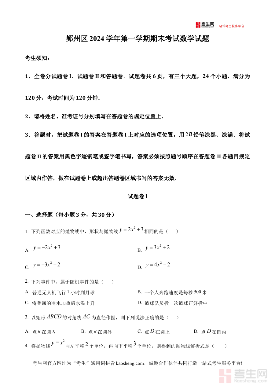 《精品解析:浙江省宁波市鄞州区2024-2025学年上学期九年级数学期末考试卷(原卷版)》是针对浙江省宁波市鄞州区2024-2025学年上学期九年级数学期末考试的配套备考资料,聚焦该地区九年级上学期数学学科的期末检测需求,为使用者提供符合本地教学进度与考试要求的原卷内容参考。