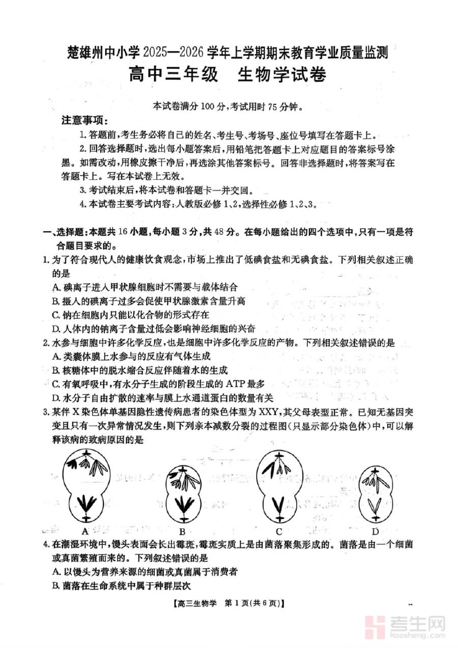 该资料主要适用于楚雄州范围内2025-2026学年上学期就读高三的学生、生物学科教师以及参与学业质量监测的教研人员。对于学生而言,它是自我评估和复习提升的重要工具;对于教师而言,它助力教学诊断与优化;对于教研人员而言,它为区域学业质量分析和教学质量提升提供关键参考,整体上对高三生物学科的教与学均具有重要的辅助价值。