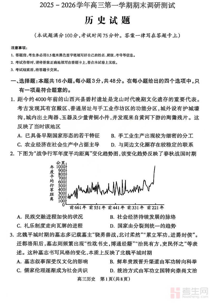本资料主要适用于吕梁地区25-26学年的高三学生及历史学科教师。对学生而言,它是期末阶段检测和备考规划的重要工具;对教师而言,可作为学情分析与教学调整的参考依据,助力提升教学质量与备考效率。