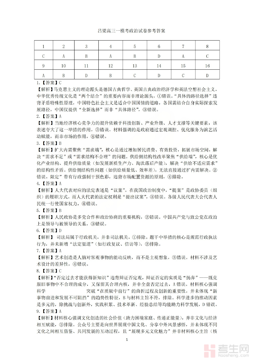 《政治答案_【吕梁一模】吕梁25-26学年高三上学期期末调研测试及答案》是吕梁地区面向25-26学年高三学生推出的上学期期末调研测试(即“吕梁一模”)政治科目配套答案资料,属于高三阶段重要的阶段性考试备考资源。该资料与本次调研测试的政治试卷紧密匹配,为考生和教学工作者提供了权威准确的作答参考依据,是验证高三上学期政治学科学习成果的关键辅助材料。