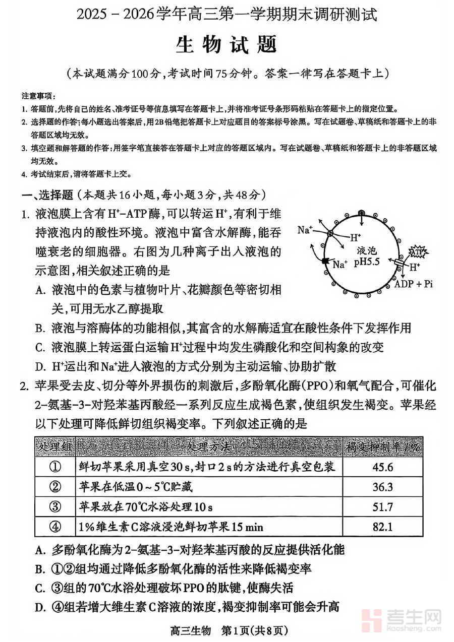 《生物试题_【吕梁一模】吕梁25-26学年高三上学期期末调研测试及答案》是面向吕梁地区25-26学年高三学生的生物学科期末调研测试资料,包含试题与对应答案,属于吕梁一模系列的重要备考资源。它紧密结合该学年高三生物教学进度及区域考试标准,为学生提供了与本地调研测试直接匹配的练习内容,助力学生熟悉考试形式与要求。