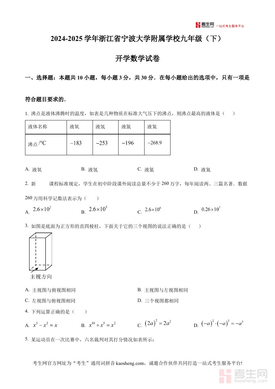 《精品解析:浙江省宁波大学附属学校2024-2025学年九年级下学期开学数学试卷(原卷版)》是针对浙江省宁波大学附属学校特定学年段的数学学科开学检测资料,聚焦2024-2025学年九年级下学期的开学阶段,属于学校内部组织的阶段性数学考试相关材料,为该阶段学生的数学学习提供直接对应的备考参考依据。