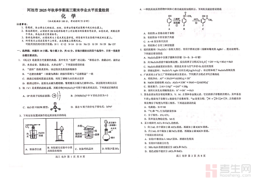 《广西河池市2025-2026学年高三上学期2月期末化学试题(含答案)》是广西河池市在2025-2026学年针对高三年级上学期2月期末阶段发布的化学学科考试资料,包含试题及配套答案,属于该阶段高三化学学科的重要备考资源,能够体现当地该学期期末化学考试的命题方向与考查重点。