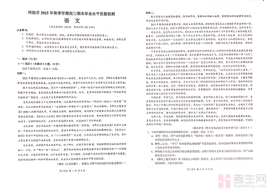 该资料主要适用于广西河池市2026届高三学生,助力其通过针对性练习完成阶段检测与备考准备;同时也可供高三语文教师用于教学反馈与教学内容调整,进一步提升教学与复习的精准性,共同推动学生语文素养与应试能力的阶段性提升。