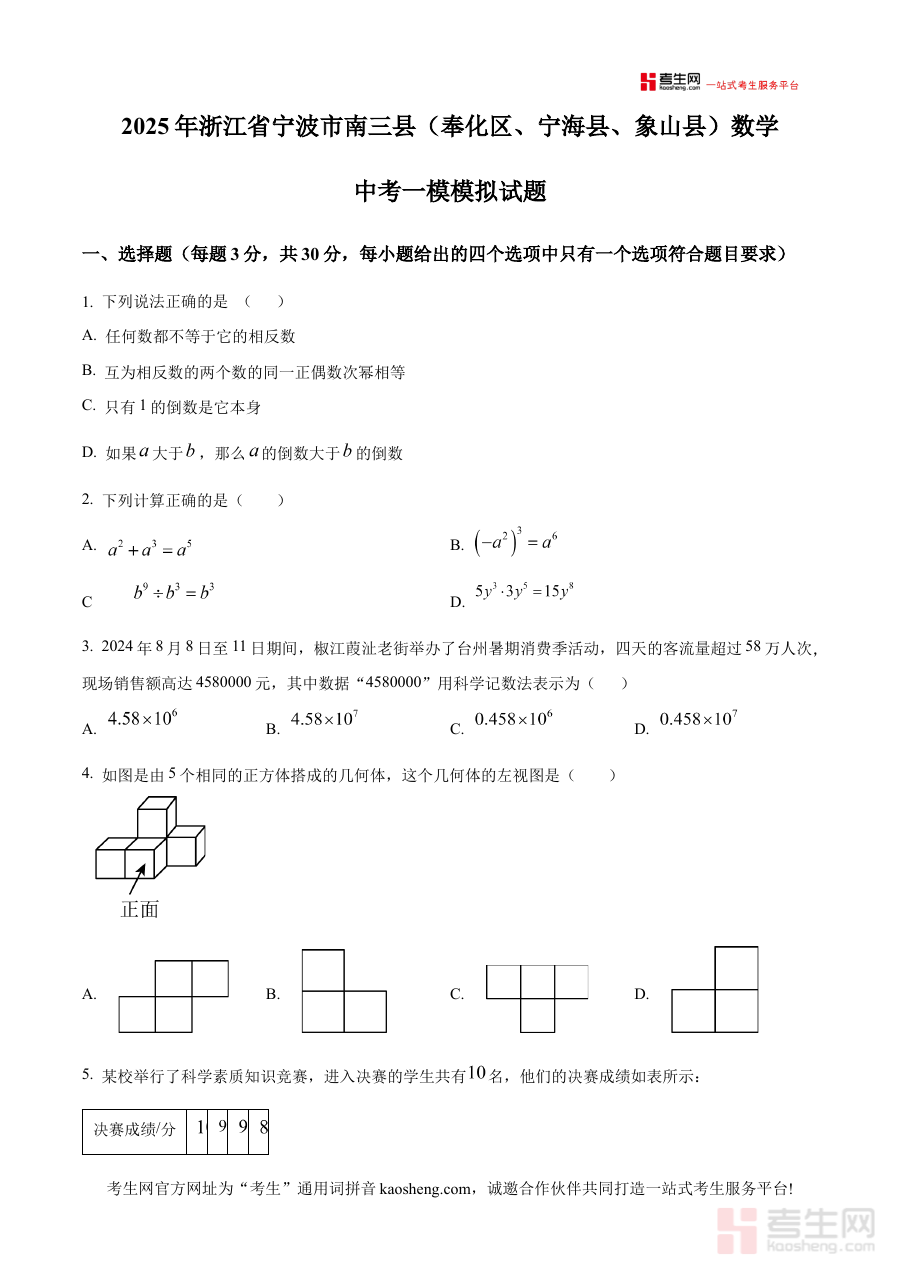 《精品解析:2025年浙江省宁波市南三县(奉化区、宁海县、象山县)数学中考一模模拟试题(原卷版)》是针对2025年浙江省宁波市奉化区、宁海县、象山县初三学生数学学科的中考一模模拟资料,聚焦该区域中考数学的阶段性考查需求,为考生提供贴合本地命题方向的模拟练习载体,助力考生提前熟悉中考一模的考试形式与区域命题特点,是适配本地初三数学教学进度与中考备考节奏的专业资料。