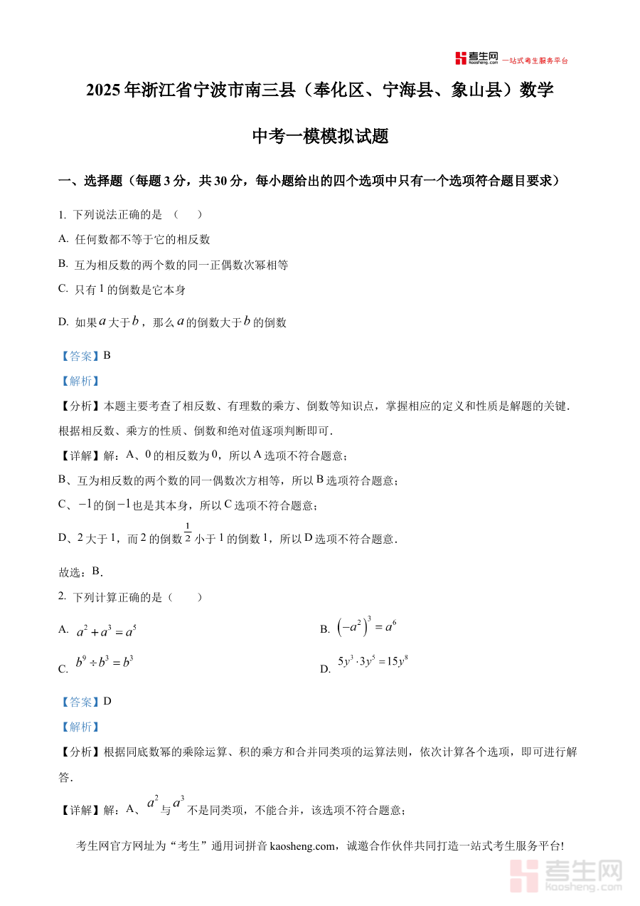 《精品解析:2025年浙江省宁波市南三县(奉化区、宁海县、象山县)数学中考一模模拟试题 (解析版)》是针对2025年浙江省宁波市奉化区、宁海县、象山县三地联合开展的数学中考一模模拟考试的配套备考资料,聚焦该区域中考前的阶段性复习需求,为考生提供贴合本地命题方向的模拟训练支持。