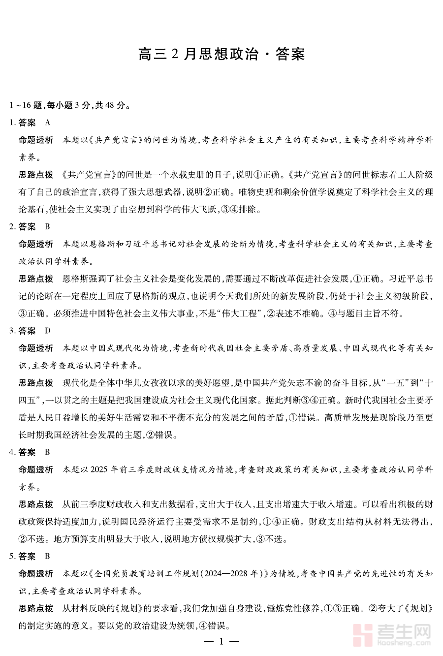 《毫州市普通高中2025—2026学年度第一学期高三期末质量检测政治答案》是毫州市教育系统针对本地普通高中2025至2026学年第一学期高三年级政治学科期末质量检测推出的官方配套答案资料。该考试属于区域性的高三阶段学业质量评估考试,覆盖毫州市所有普通高中高三学生,旨在全面反映学生在本学期政治学科学习中的知识掌握程度与能力发展水平,为后续的教学调整与高考备考提供科学的数据参考。