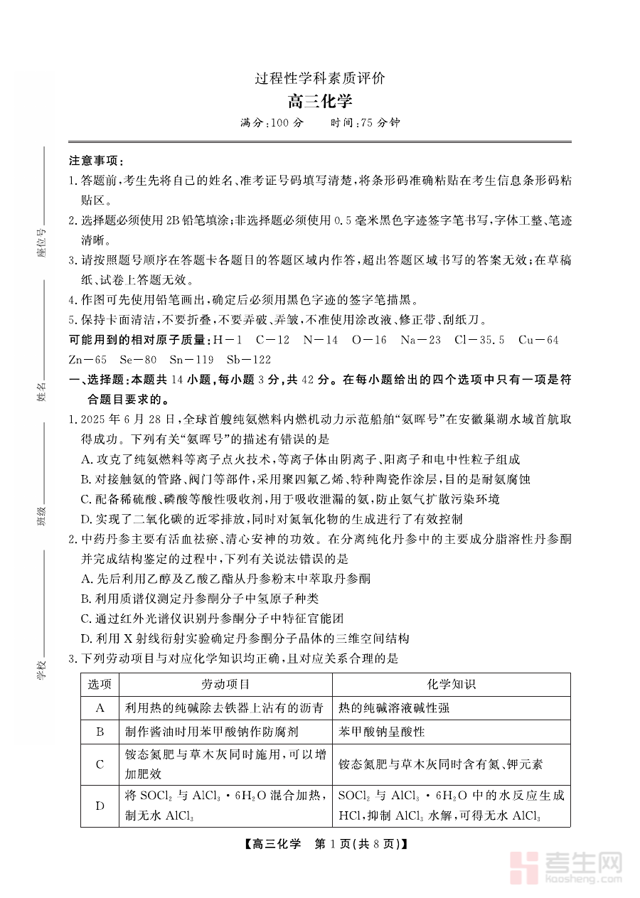 《安徽省鼎尖联考2025-2026学年高三上学期期末过程性学科素质评价 化学》是安徽省在2025-2026学年针对高三学生开展的鼎尖联考系列中的期末阶段化学学科评价资料,属于高三上学期期末过程性学科素质评估范畴,是高三化学学科备考进程中的重要阶段性资源,能够客观反映该地区高三学生在学期末化学学科的学习状况与阶段性成果。