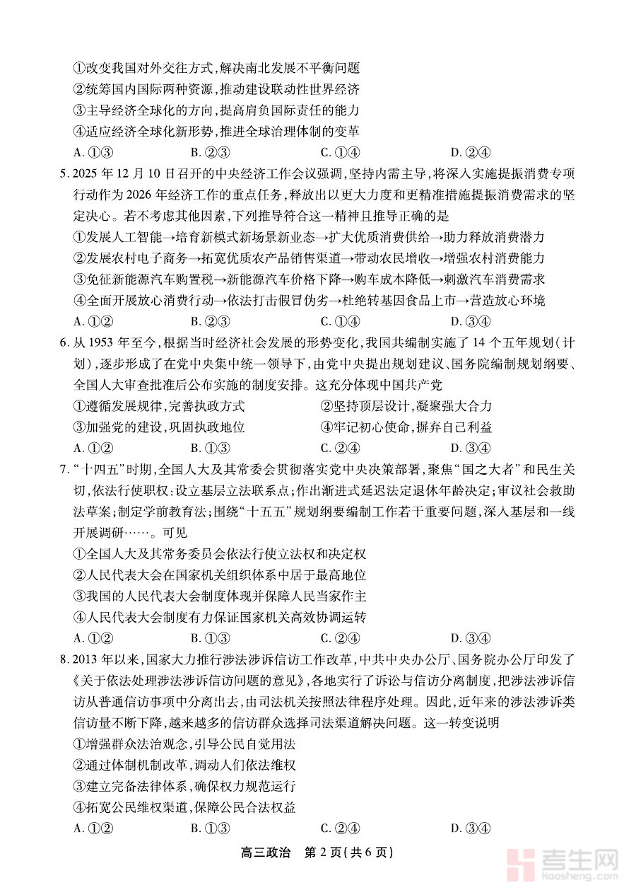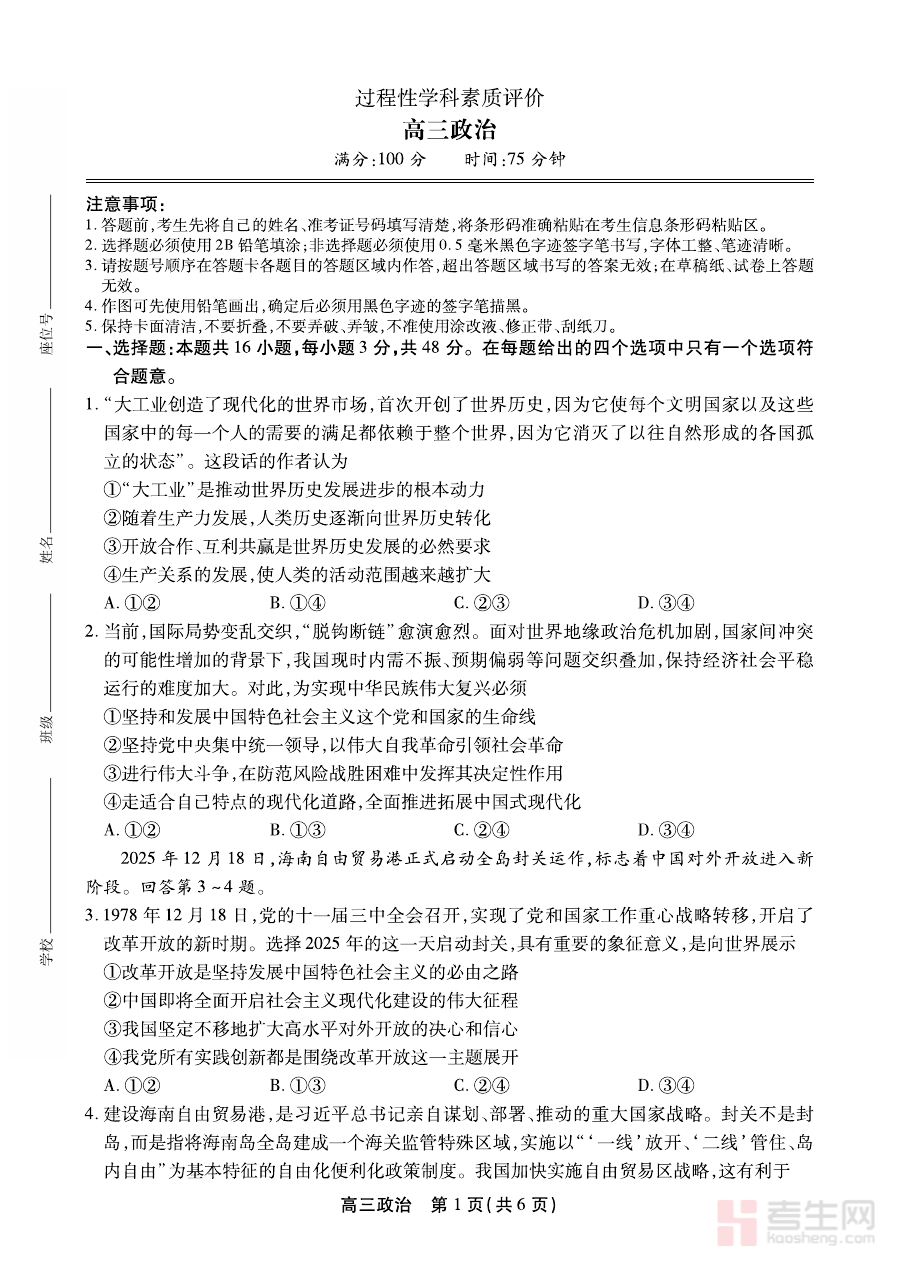 《安徽省鼎尖联考2025-2026学年高三上学期期末过程性学科素质评价 政治》是安徽省鼎尖联考体系在2025-2026学年针对高三年级上学期期末阶段推出的政治学科过程性评价资料,属于高三期末备考环节的重要辅助资源,其设计紧扣高三上学期政治学科的学习进度与阶段目标,旨在通过规范化的评价形式反映学生的学科素质发展情况。