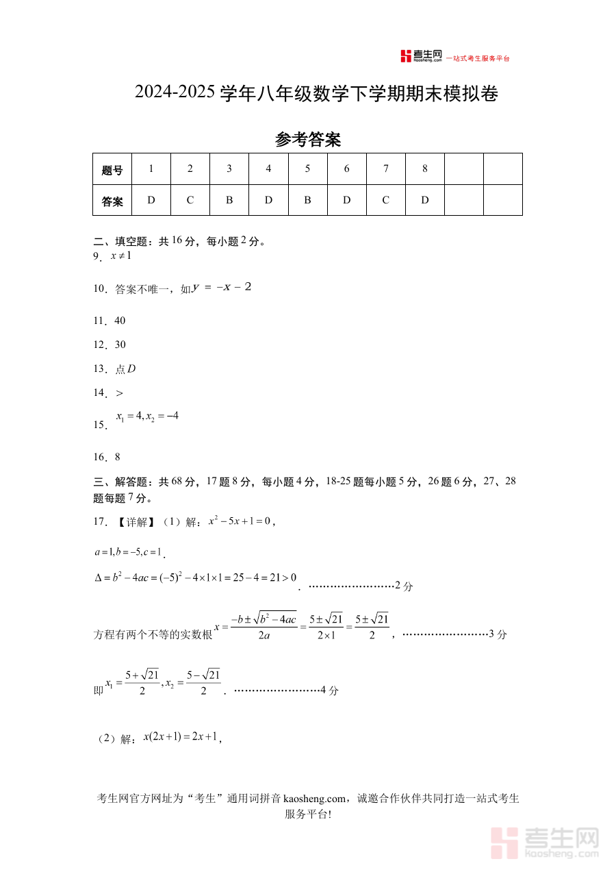 本资料适用于北京地区八年级学生及数学学科教师群体。对于学生而言,借助参考答案能及时修正模拟测试中的错误,深化对知识点的理解与应用能力;对于教师来说,可通过参考答案把握模拟卷的评分标准与答题逻辑,提升试卷评阅效率与教学指导的针对性,整体推动期末备考质量的提升。
