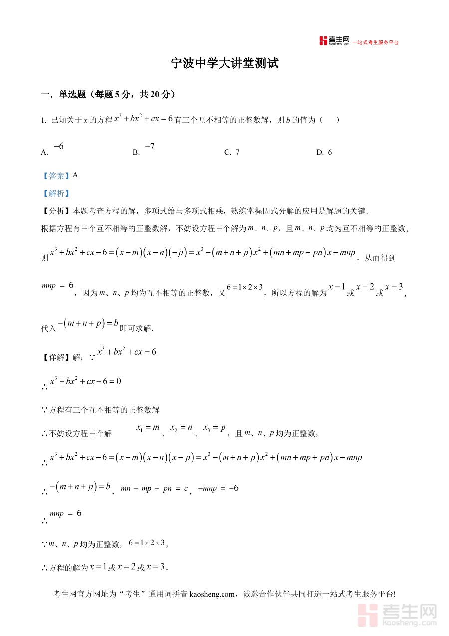 《精品解析:浙江省宁波市宁波中学2025年九年级数学大讲堂测试卷(解析版)》是针对浙江省宁波市宁波中学2025届九年级学生设计的数学学科备考资料,结合该校九年级数学教学进度与阶段测试需求,以解析版形式呈现大讲堂测试卷内容,为学生提供精准的备考参考依据。