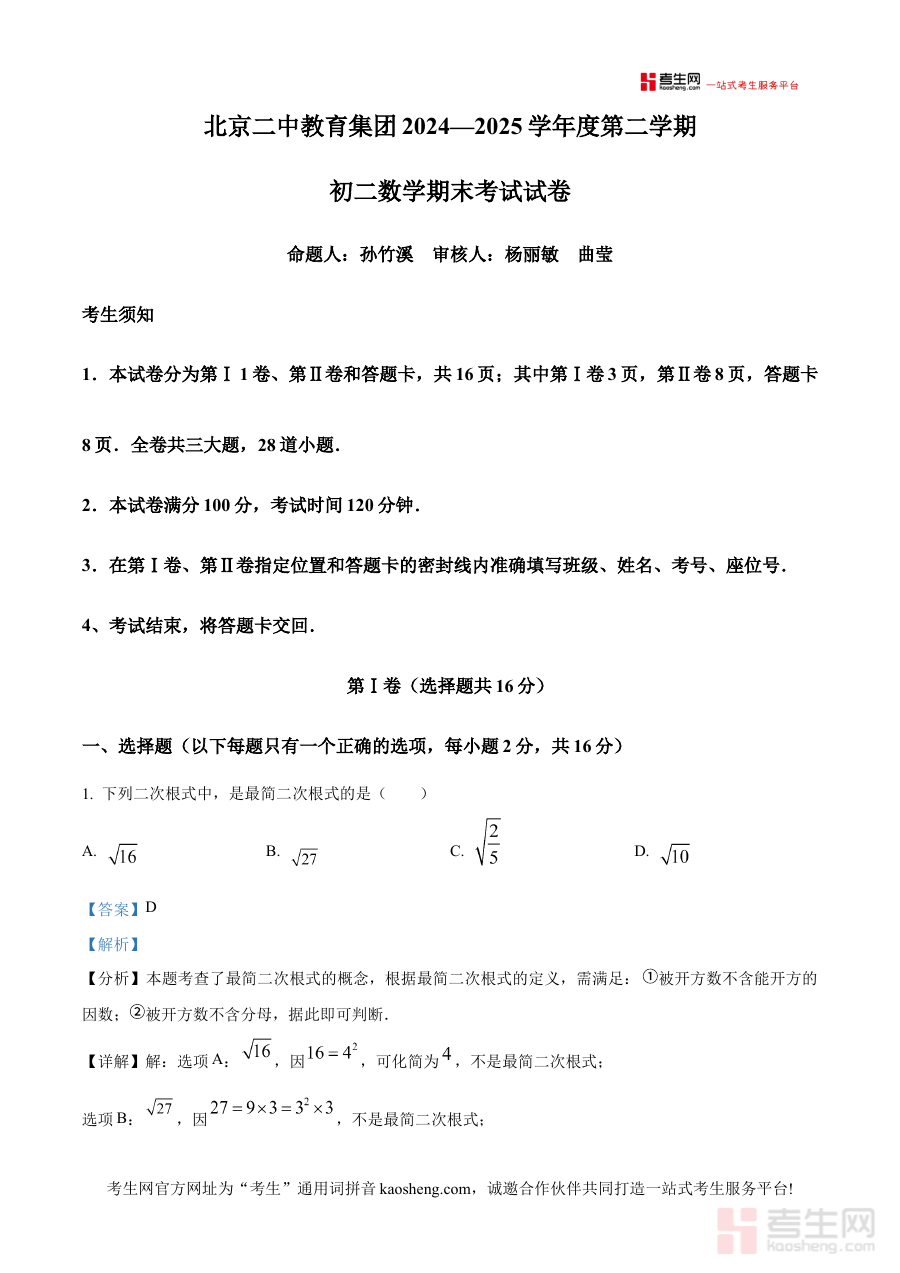《精品解析:北京二中教育集团2024—2025学年八年级数学下册期末试题(解析版)》是聚焦北京地区2024—2025学年八年级下学期数学学科期末评估的备考资料,依托北京二中教育集团的教学资源背景,为使用者提供契合区域教学进度与期末考查标准的参考素材。