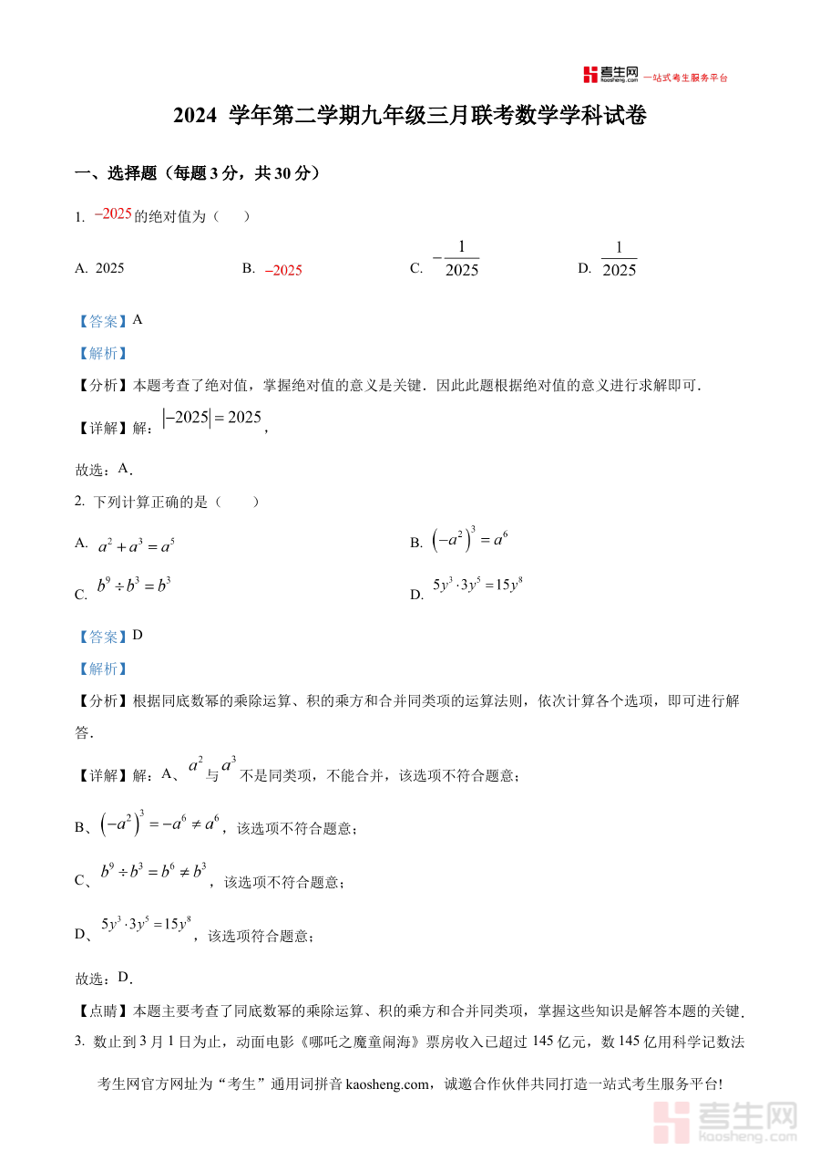 《精品解析:浙江省宁波市鄞州实验中学2024-2025学年九年级下学期3月月考数学试题(解析版)》是针对浙江省宁波市鄞州实验中学2024-2025学年九年级下学期3月数学月考编制的备考资料,聚焦该阶段数学学科的阶段性考查需求,为师生提供与本次考试直接相关的解析内容。