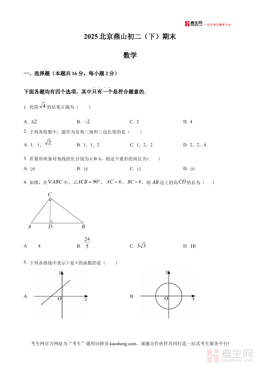 《精品解析:北京市燕山区2024-2025学年八年级下学期6月期末数学试卷(原卷版)》是针对北京市燕山区2024-2025学年八年级下学期6月期末数学考试的备考资料,聚焦该地区该学年八年级下学期期末阶段的数学学科检测需求,为相关教学及学习活动提供对应考试的原卷参考。