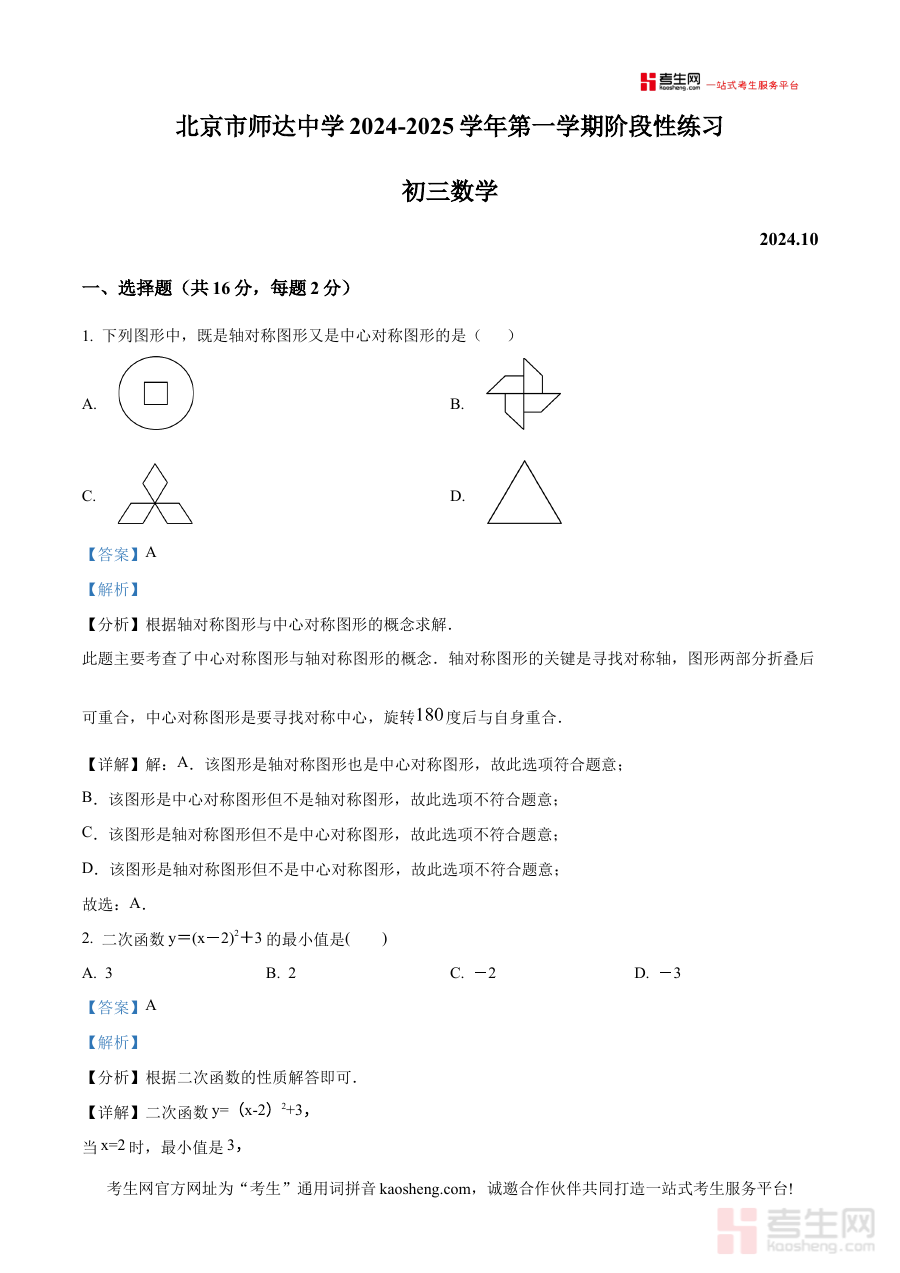 《精品解析:北京市师达中学2024-2025学年九年级上学期数学第一次月考试题(解析版)》是针对北京市师达中学2024至2025学年九年级上学期数学学科首次月度考试的配套解析资料,精准对应该阶段数学学科的阶段性评价需求,为相关使用者提供具有明确指向性的备考辅助资源。
