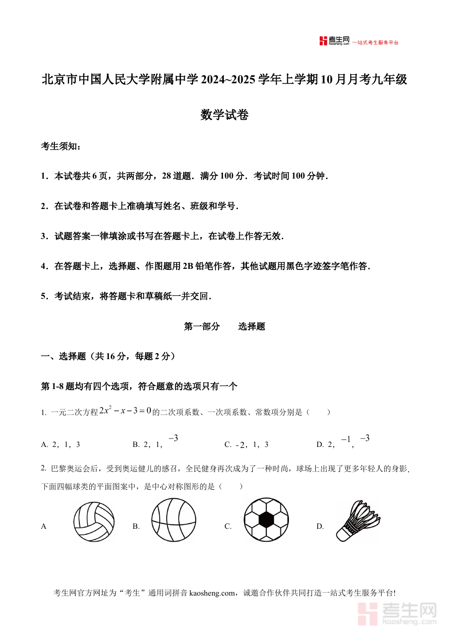 《精品解析:北京市中国人民大学附属中学2024~2025学年上学期10月月考九年级数学试卷(原卷版)》是北京市中国人民大学附属中学针对2024至2025学年上学期九年级学生10月月考推出的数学学科备考资料,紧密贴合该校该阶段的教学进度与考试要求,为学生提供与校考实际高度匹配的练习资源。
