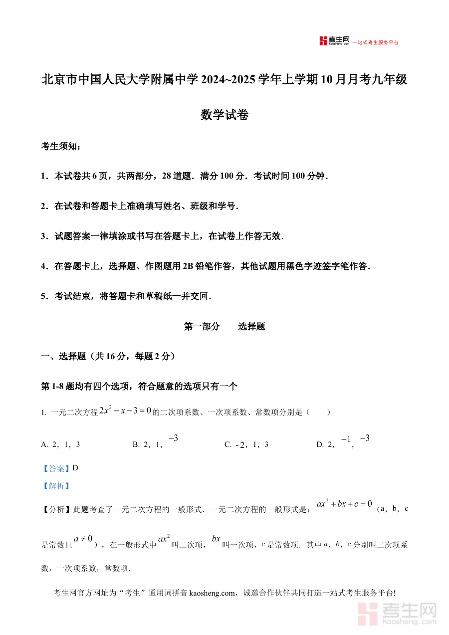 其适用人群主要为北京市中国人民大学附属中学九年级在读学生,以及关注该校九年级数学阶段性考察特点的学习者,解析版的呈现形式能够帮助使用者深入理解试题对应的知识应用逻辑与解题思路,强化对阶段核心知识点的掌握程度,对于提升阶段检测应对能力和优化后续备考策略具有显著实用价值。