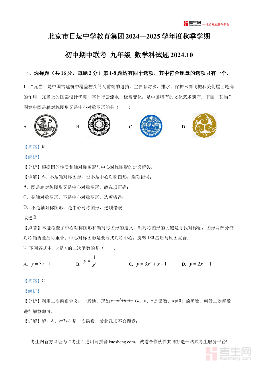 《精品解析:北京市日坛中学教育集团2024—2025学年上学期九年级期中考试数学试卷(解析版)》是面向北京市日坛中学教育集团九年级学生推出的期中数学考试配套解析资料,精准对应2024-2025学年上学期的期中检测时间节点,紧密贴合该教育集团的教学进度与考试命题方向,为学生提供与实际考试场景高度匹配的解析内容,是该阶段数学学习与备考的重要辅助资源。