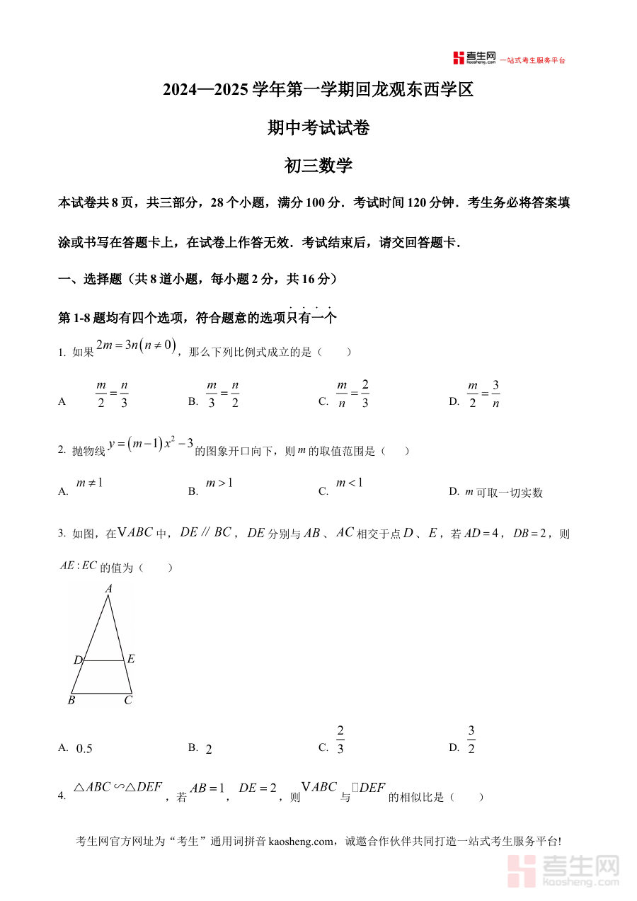 《精品解析:北京市昌平区回龙观东西学区2024-2025学年上学期九年级期中数学试卷(原卷版)》是针对北京市昌平区回龙观东西学区2024至2025学年第一学期九年级期中数学考试的备考资料,聚焦该学区特定阶段的数学学科期中检测需求,为相关使用者提供与考试实际形式匹配的原卷内容。