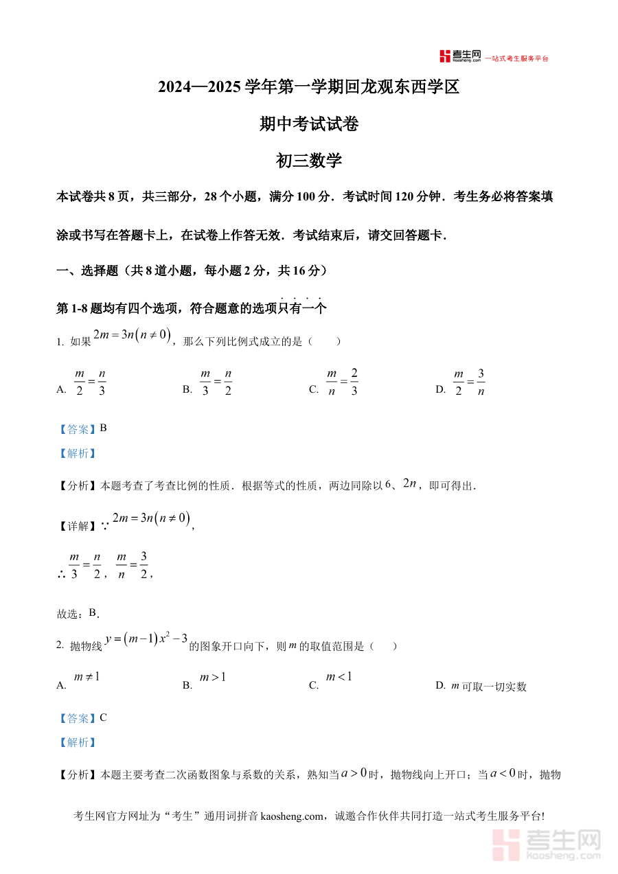 《精品解析:北京市昌平区回龙观东西学区2024-2025学年上学期九年级期中数学试卷(解析版)》是针对北京市昌平区回龙观东西学区2024至2025学年第一学期九年级期中数学考试的专业备考资料,它紧密贴合该学区九年级上学期期中阶段的数学教学目标与考试命题方向,为使用者提供了与本地实际教学场景和考试要求高度匹配的学习资源支持。