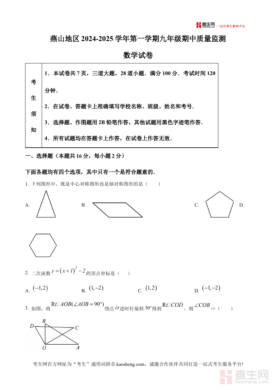 《精品解析:北京市燕山区2024-2025学年九年级上学期期中数学试题(原卷版)》是针对北京市燕山区2024-2025学年九年级上学期期中数学考试的备考资料,精准对应该地区该学年九年级上半学期期中阶段的数学学科考试场景,为使用者提供贴合本地考试实际的资源支持。