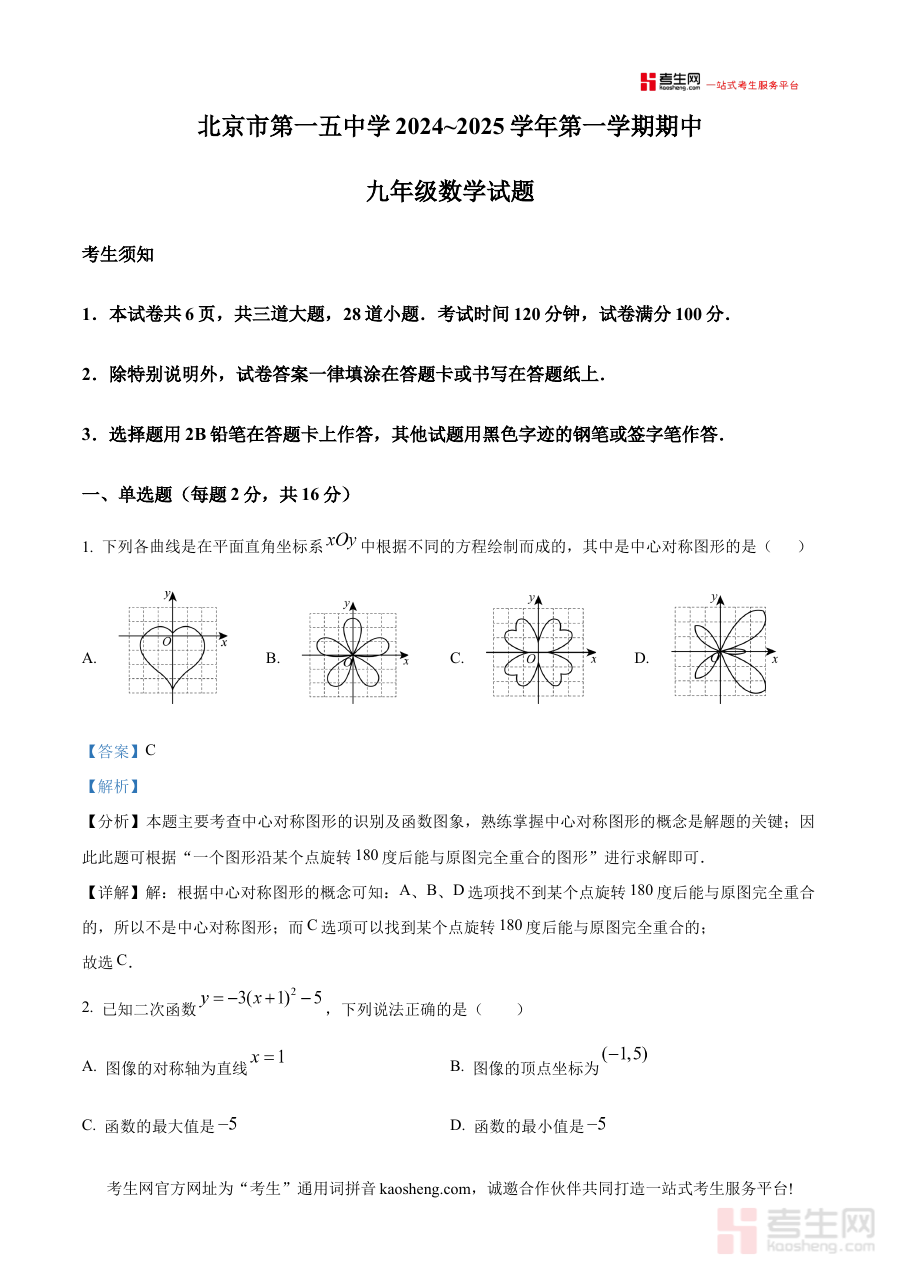 《精品解析:北京市第一五九中学2024~2025学年上学期九年级数学期中试卷(解析版)》是针对北京市第一五九中学2024至2025学年上学期九年级数学期中考试的配套解析类备考资料,明确对应特定学年、学期、年级、学科及考试类型,为相关师生提供了与校内期中测试直接关联的学习支持材料,帮助使用者精准对接校内教学进度与考试要求。