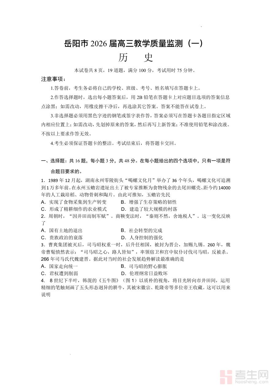 《岳阳市2026届高三年级教学质量监测(一)历史》是面向湖南省岳阳市2026届高三学生的区域性教学质量监测资料,属于高三阶段首次历史学科教学质量评估的配套备考资源,旨在为该阶段的历史学习提供针对性的检测与准备支持。
