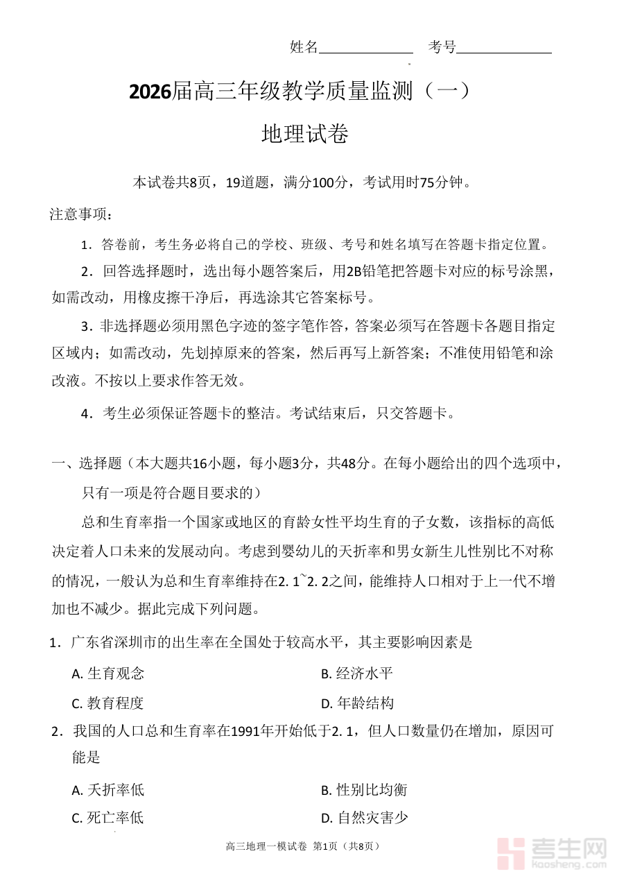 作为高三年级首次教学质量监测的地理学科资料,其核心用途在于帮助学校与教师精准诊断学生地理学习中的优势与薄弱环节,为制定个性化教学计划与备考策略提供依据;同时助力学生清晰认知自身学习水平,明确后续学习重点,合理规划备考进程,提升备考的针对性与效率。