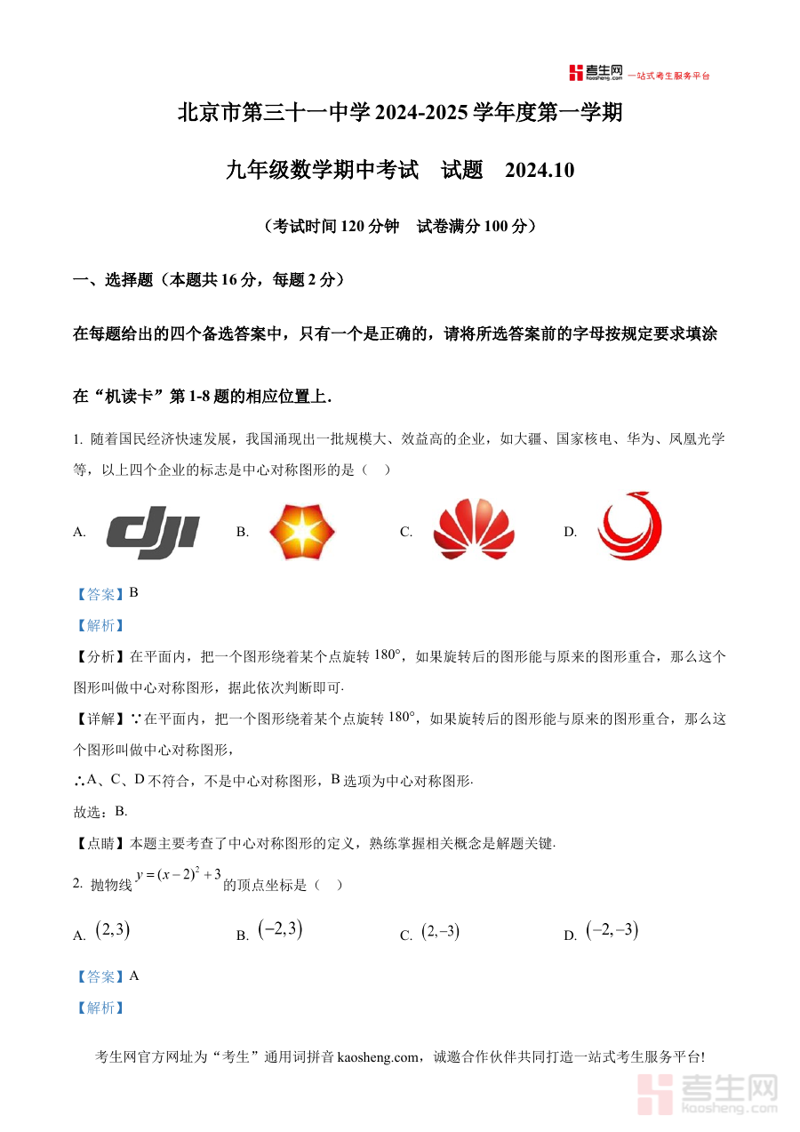 《精品解析:北京市第三十一中学2024—2025学年上学期九年级期中数学试卷(解析版)》是针对北京市第三十一中学特定学年学期的九年级期中数学考试的配套解析资料,聚焦该学校2024至2025学年上半学期九年级学生的期中数学测评需求,为学生和教师提供了与学校期中测试直接相关的解析内容,是适配该阶段数学学习进度的针对性备考资源。